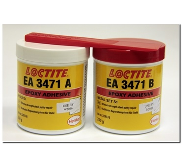 Kovem plněný tmel LOCTITE EA 3471 - dvousložkový epoxid, univerzální ocelí plněný nestékající. Používá se k renovaci opotřebených kovových součástek, k utěsňování trhlin v nádržích, odlitcích, nádobách a ventilech, na opravy nestrukturálních vad v ocelových skříních, povrchu vzduchových ucpávek a důlků způsobených kavitací a/nebo korozí.